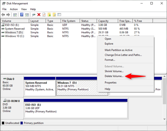 В окне «Управление дисками» щелкните правой кнопкой мыши или коснитесь и удерживайте раздел, который вы хотите удалить (тот, в котором вы удалили операционную систему), и выберите «Удалить том», чтобы удалить его. Затем вы можете добавить доступное пространство для других разделов.