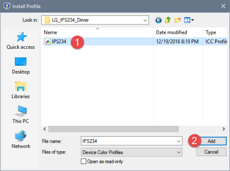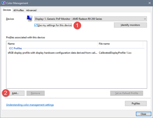 После того, как вы выбрали правильный дисплей, нажмите или нажмите на кнопку Добавить в левом нижнем углу окна. Обратите внимание, что если цветовой профиль уже установлен для выбранного монитора, может случиться, что кнопка Добавить отключена. Если это так, но вы все еще хотите заменить существующий цветовой профиль на загруженный, убедитесь, что вы отметили флажок «Использовать мои настройки для этого устройства». Затем вы сможете использовать кнопку Добавить.