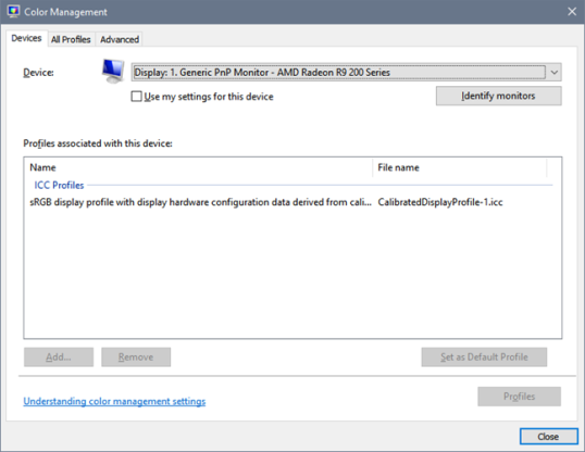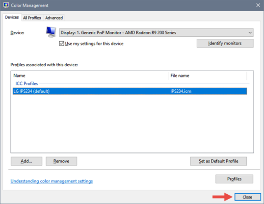 Если у вас есть несколько мониторов, вы должны повторить процедуру для каждого монитора и убедиться, что вы загружаете и устанавливаете цветовые профили, которые являются специфическими для каждого.