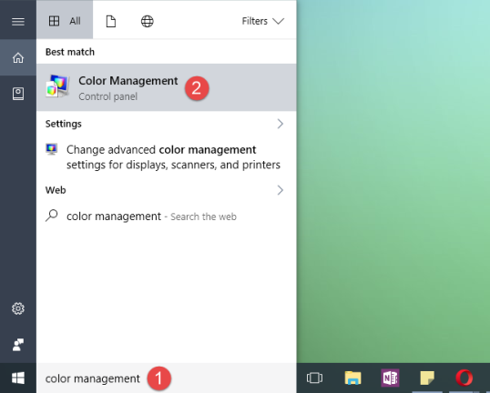 В Windows 10 используйте поле поиска Cortana на панели задач, чтобы ввести слова «управление цветом». Затем в списке результатов нажмите или коснитесь ярлыка Управление цветом.