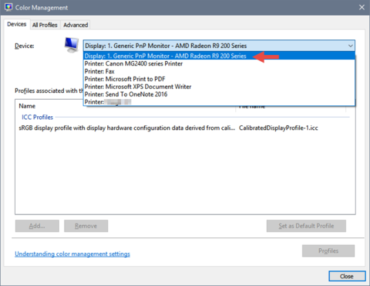 В окне «Управление цветом» найдите вкладку «Устройства» и откройте ее. В раскрывающемся списке «Устройство» у вас есть список устройств, установленных на вашем компьютере, начиная с вашего монитора. Если у вас несколько мониторов, выберите монитор, для которого вы только что загрузили цветовой профиль. Здесь может пригодиться кнопка «Определить мониторы», так как она показывает ваши различные дисплеи и их количество: дисплей 1, дисплей 2 и т.д.