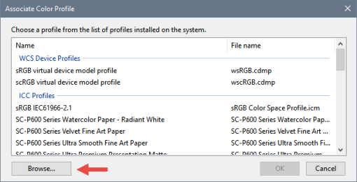Откроется окно «Ассоциированный цветовой профиль», где вы можете увидеть список всех установленных цветовых профилей. Эти профили могут быть установлены и использованы другими устройствами, такими как принтер или сканер, или программным обеспечением для редактирования изображений, таким как Adobe Photoshop. Нажмите или коснитесь Обзор и найдите местоположение только что загруженного цветового профиля.