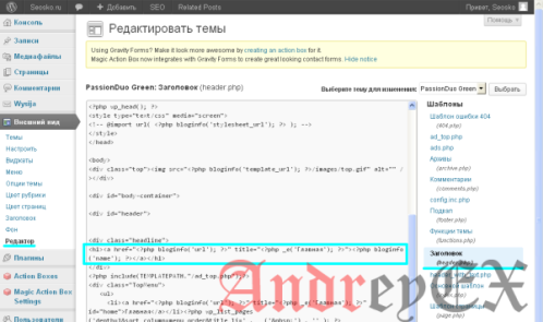 С правой стороны редактора, есть список доступных для редактирования файлов активной темы. Над списком файлов шаблонов, есть выпадающее меню, которое позволяет пользователям переключаться между темами даже неактивных тем. Часто пользователи путаются этой функции, потому что они думают, что выбирая другую тему и активирует эту тему. Если вы выберете другую для редактирования кода, то она открывает только файлы темы в редакторе. Она не активировать тему. Вы должны активировать тему, перейдя на внешний вид »Темы.