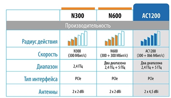 Единственный на данный момент внутренний PCI Wi-Fi адаптер. За счет двух антенн увеличивает радиус действия. Поэтому если у вас большая квартира и системный блок, то стоит все же присмотреться именно к этому аппарату. Если посмотрите на таблицу сравнения, предыдущих моделей, то можно заметить, что скорость передачи подросла до 866 Мбит в секунду. Две внешние дипольные антенны с коэффициентом усиления 4,5 dBi.