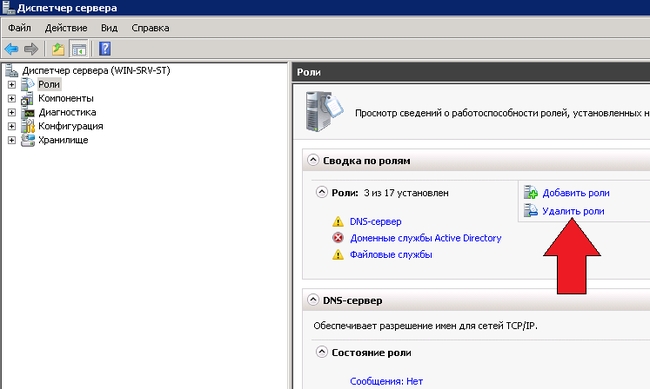 В диспетчере удаляемого сервера, он называется WIN-SRV-ST, выбираем опцию – Удалить роли.
