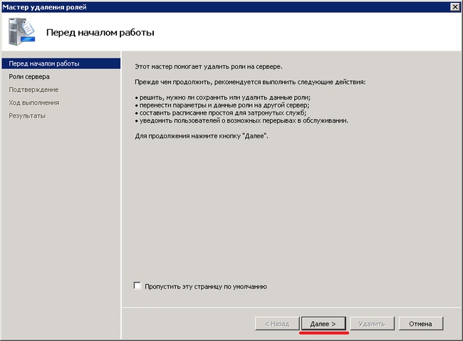 Откроется мастер удаления ролей. Читаем – нажимаем >>Далее.