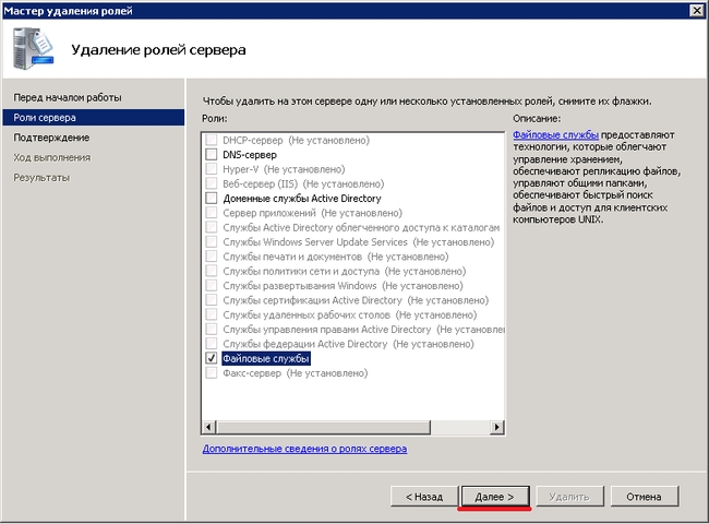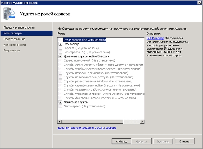 В следующем окне можно увидеть список ролей сервера. С тех ролей, которые нужно удалить, снимаем галочки.