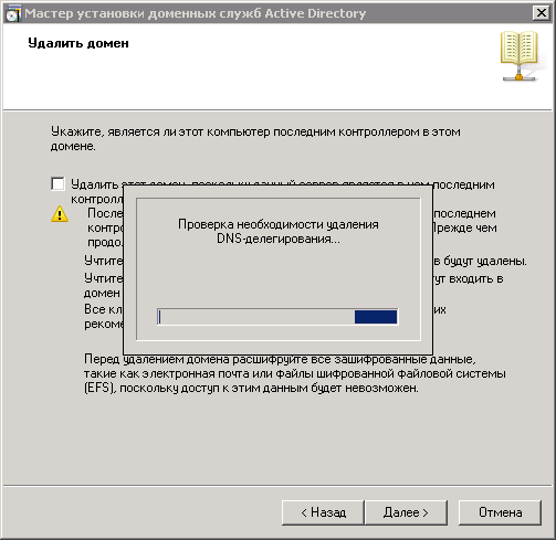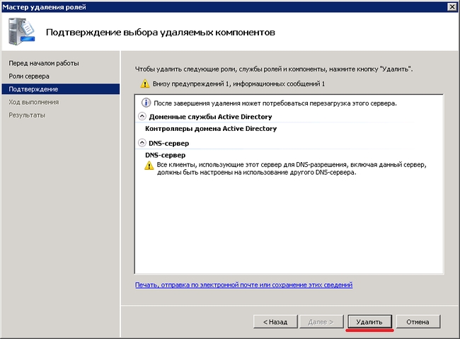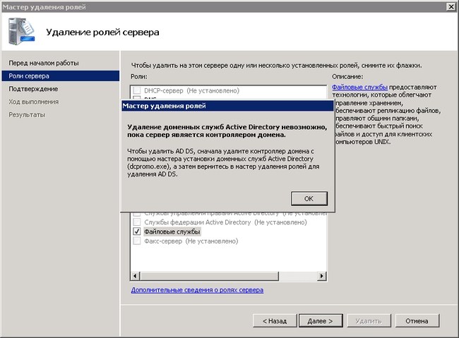 При убирании галочки с пункта Доменные службы Active Directory получаем сообщение: Удаление доменных служб Active Directory невозможно, пока сервер является контроллером домена.