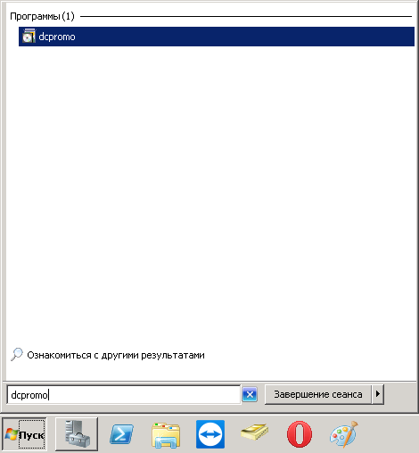 Для запуска dcpromo пишем его в поисковой строке и запускаем из результатов поиска.