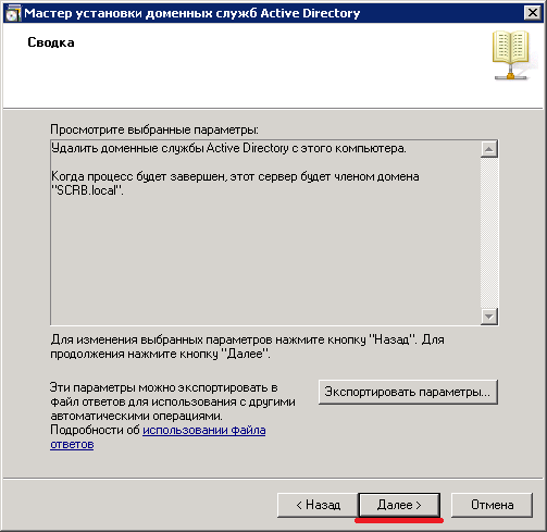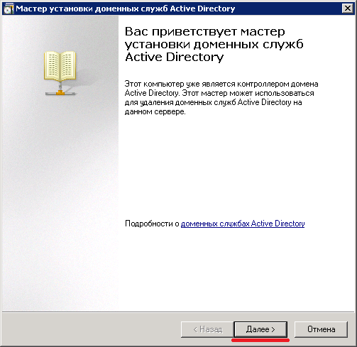 Возвращаемся к Мастеру dcpromo, нажимаем ОК >> Далее.