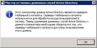 Появившееся сообщение предупреждает о том, что сервер является хранителем глобального каталога.
