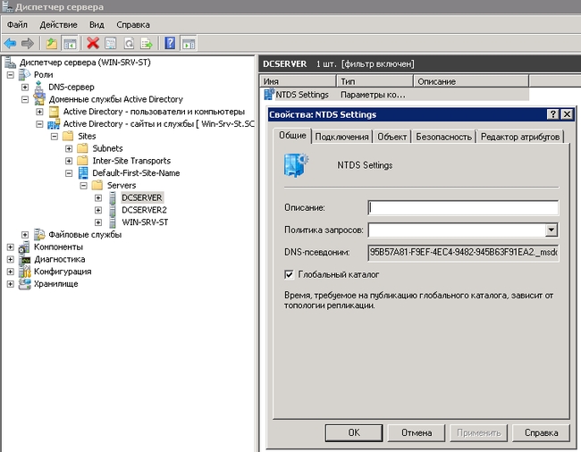 По очереди выбираем доступные контроллеры домена, правой кнопкой мыши на NTDS Settings >> Свойства и смотрим, отмечена ли галочка напротив надписи – Глобальный каталог. В данном случае глобальный каталог хранится на всех DC, поэтому с деинсталируемого WIN-SRV-ST его можно удалять.