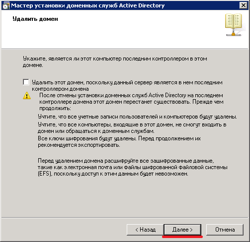 В следующем окне галочку не ставим. Наш контроллер домена не последний. >> Далее.