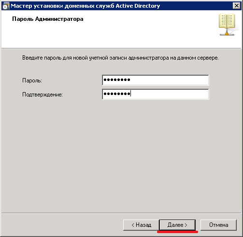 Далее необходимо ввести пароль для новой учетной записи администратора на данном сервере.