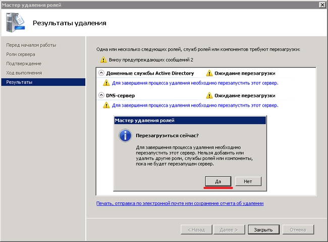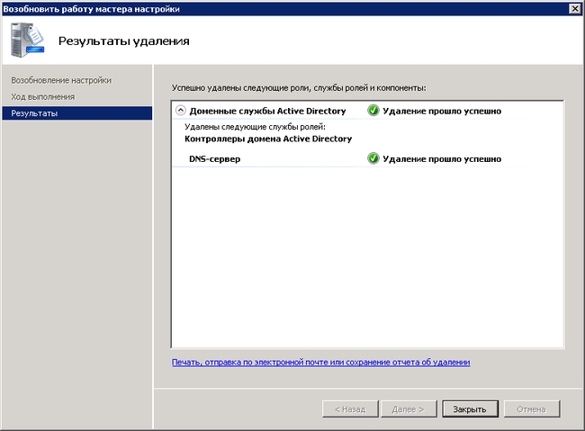 В итоге роли и службы удалены, сервер больше не является контроллером домена. Виртуальную машину можно демонтировать.