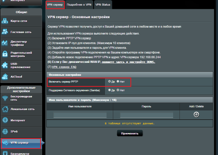 2. Включите сервер PPTP. Список поддерживаемых протоколов зависит от вашего роутера — чаще всего встречаются PPTP и L2TP.