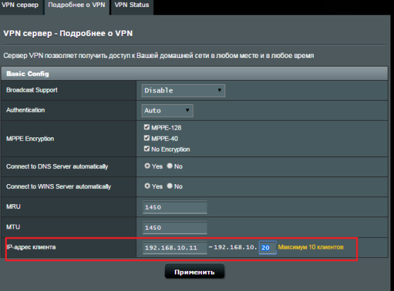 5. Пролистайте страницу ниже и настройте IP-адреса клиентов VPN-сервера. Разные роутеры поддерживают разное количество клиентов. У Asus, например, это число равно десяти.