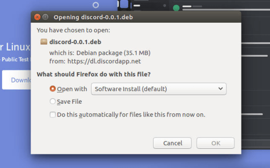 Ваш браузер спросит вас, хотите ли вы открыть файл с помощью установщика программного обеспечения Ubuntu или просто загрузить файл. Любой из вариантов хорош, но все будет намного проще, выбрав установщик программного обеспечения.