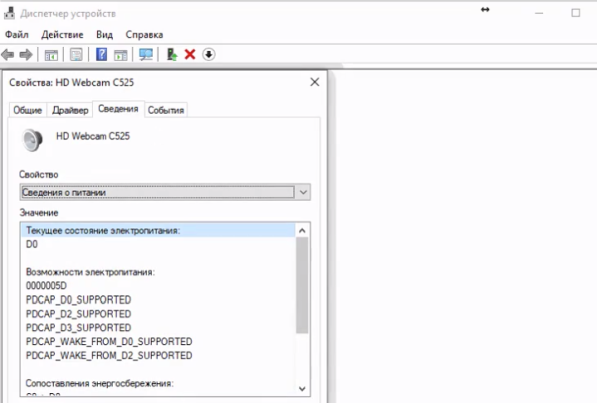 Посмотреть поддерживаемые режимы и таблицу соответствий конкретного устройства можно в «Диспетчере устройств». Для этого нужно открыть свойства устройства и на вкладке «Сведения» найти «Сведения о питании«: