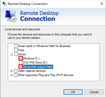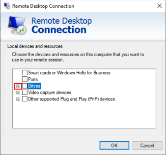 • В поле Локальные устройства и ресурсы вы можете настроить RDC на совместное использование определенных устройств с удаленным ПК. Чтобы поделиться локальными файлами и папками, нажмите стрелку + рядом с Дисками, чтобы развернуть этот раздел.