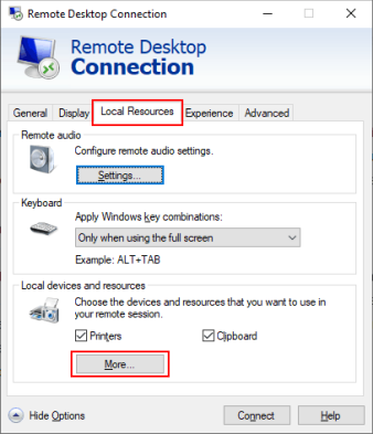 • Это отобразит параметры конфигурации для RDC. Перейдите на вкладку «Локальные ресурсы», чтобы получить доступ к настройкам общего доступа для сеанса удаленного рабочего стола. Нажмите Дополнительно внизу под разделом Локальные устройства и ресурсы.