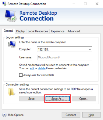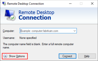 • Если вы хотите сохранить настройки подключения для более удобного доступа или использовать их на другом устройстве, нажмите Показать параметры в средстве подключения к удаленному рабочему столу.