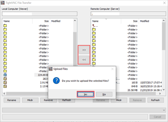 • В окне TightVNC File Transfer выберите файлы и папки, которые вы хотите переместить из A в B (с локального компьютера на удаленный компьютер или наоборот). Нажмите кнопку >> или <<, чтобы начать передачу. Нажмите Да, чтобы подтвердить, что вы хотите начать передачу.