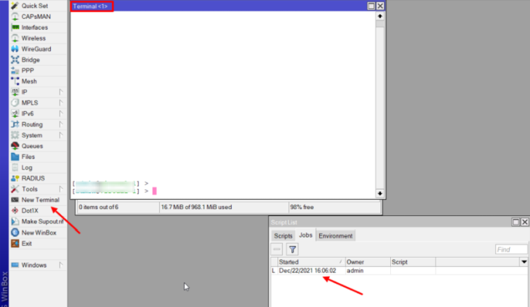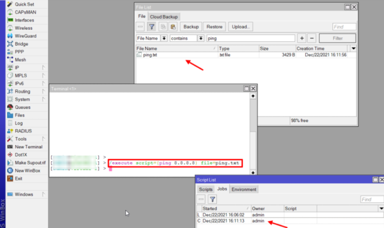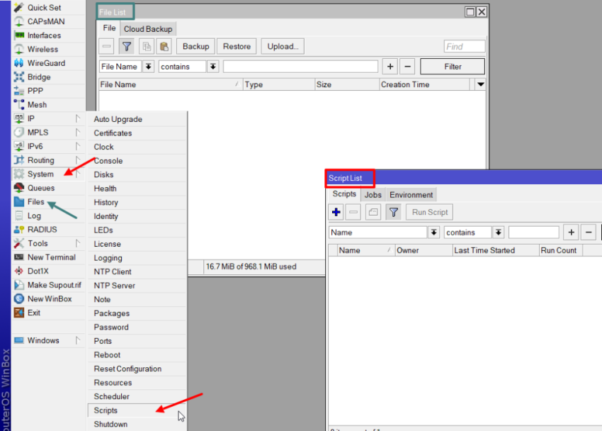 Во-первых, откройте два окна в WinBox: File List (Files) и Script List (System / Scripts):