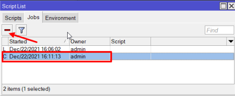 /system/script/job/print terse 0 owner=admin policy=local,telnet,ssh,ftp,reboot,read,write,policy,test,winbox,password,web,sniff, sensitive,api,romon,dude,tikapp,rest-api started=dec/22/2021 16:06:02 type=login 1 owner=admin policy=local,telnet,ssh,ftp,reboot,read,write,policy,test,winbox,password,web,sniff, sensitive,api,romon,dude,tikapp,rest-api parent=*1 started=dec/22/2021 17:25:15 type=command