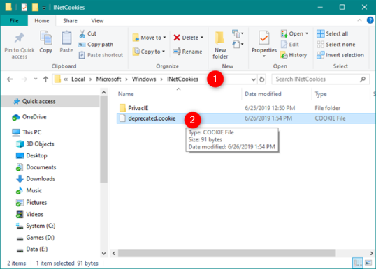 Если вы используете версию Windows 10 до 1709 Fall Creators Update , вы можете найти файлы cookie, созданные Internet Explorer, по следующему пути: «C:UsersВаше имя пользователяAppDataLocalMicrosoftWindowsINetCookies». Однако в последних версиях Windows 10 файлов cookie больше нет. Единственное, что вы найдете, — это файл deprecated.cookie, в котором содержится только следующий текст: «Файлы cookie больше не хранятся в файлах. Пожалуйста, используйте API-интерфейсы Internet * Cookie * для доступа к файлам cookie».