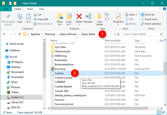 Opera хранит все файлы cookie в одном файле под названием Cookies, как Google Chrome. Файл Cookies находится по следующему пути: «C:UsersВаше имя пользователяAppDataRoamingOpera SoftwareOpera Stable».
