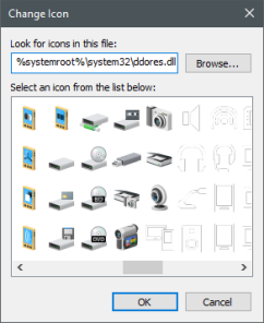 Ddores.dll содержит значки для аппаратных устройств и ресурсов, таких как динамики, наушники, экраны, компьютеры, пульты дистанционного управления и игровые планшеты, мыши и клавиатуры, камеры, принтеры и так далее.