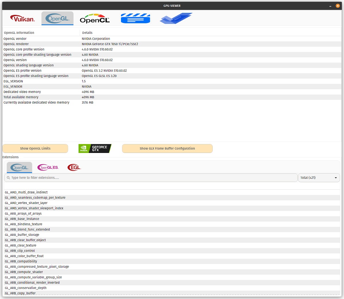 Предоставляет информацию OpenGL, информацию OpenGL ES, аппаратные ограничения и расширения OpenGL, отображаемые в соответствии с различными поставщиками, просмотр настроек кадрового буфера GLX и информацию EGL, информацию EGL