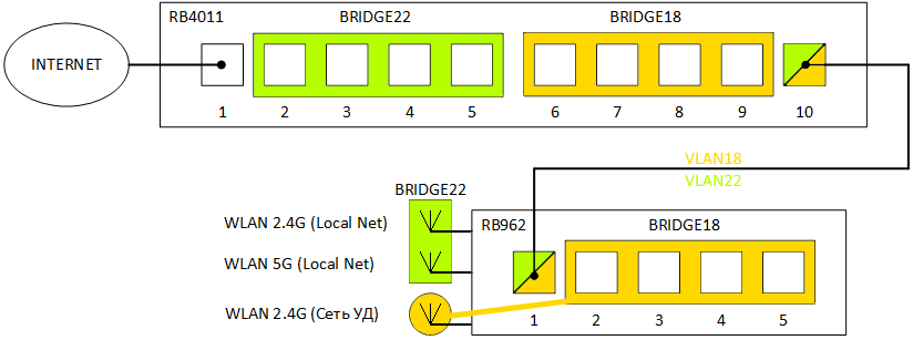 • Bridge 22, IP адрес 192.168.22.2, основные wlan интерфейсы 2.4G и 5G, vlan22 untagged — домашняя локальная сеть
