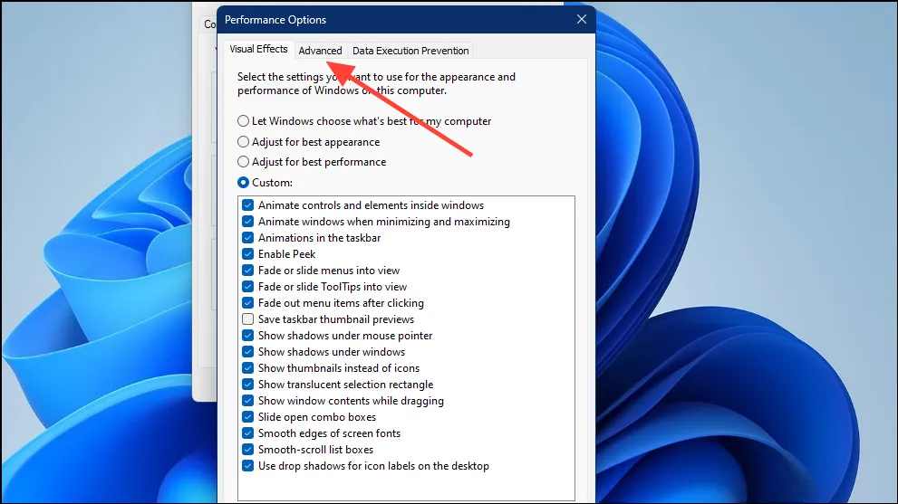 - Откроется всплывающее окно «Дополнительные настройки», в котором по умолчанию открыта вкладка «Дополнительно». Нажмите кнопку «Настройки» в разделе «Производительность».