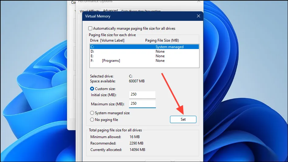 - Когда вы закончите, нажмите кнопку «Установить», а затем кнопку «ОК» внизу. Если проблема возникла из-за нехватки виртуальной памяти, ее следует устранить сейчас.