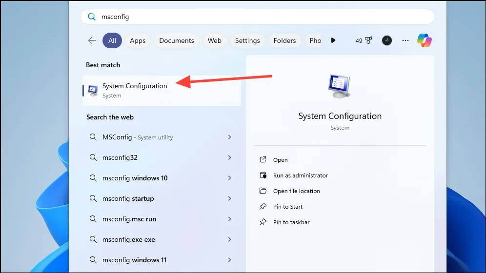 msconfigчтобы получить доступ к конфигурации системы. - Когда оно появится, нажмите на него, чтобы открыть.
