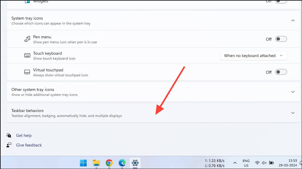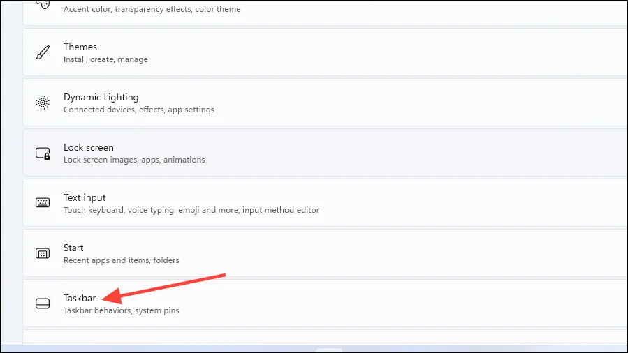 - Прокрутите вниз до параметра «Панель задач» и щелкните его, чтобы просмотреть все настройки, связанные с панелью задач.