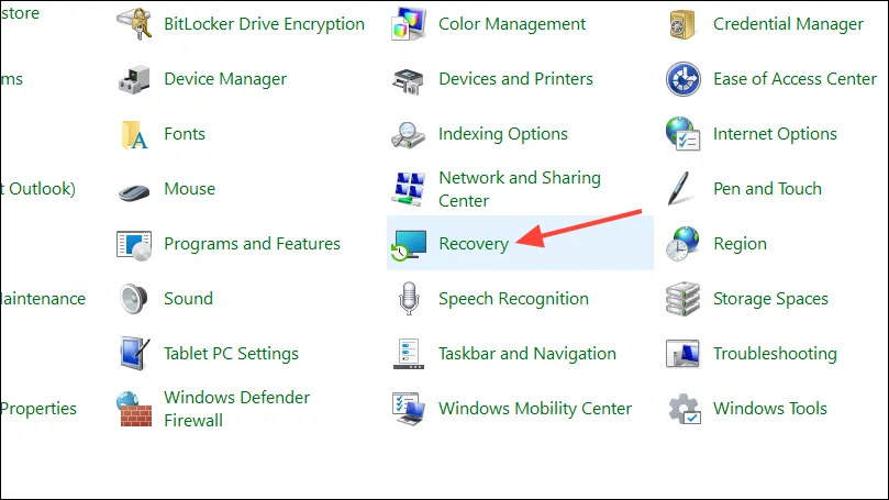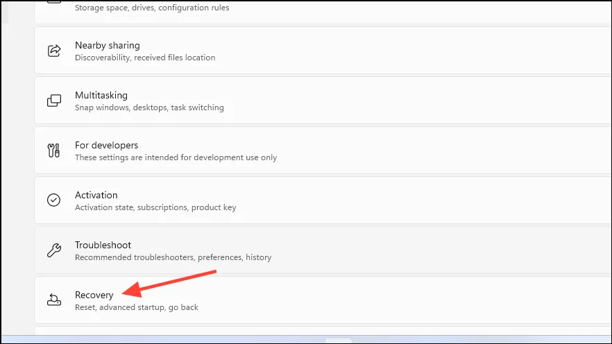 - На странице «Система» прокрутите вниз и нажмите «Восстановление».