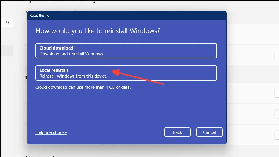 - После выбора варианта вы можете переустановить Windows из облака или локально. Нажмите на опцию «Локальная переустановка», чтобы продолжить.