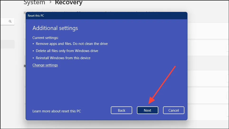 - На следующей странице вы сможете просмотреть настройки сброса. Нажмите кнопку «Далее», если вас устраивают выбранные настройки.