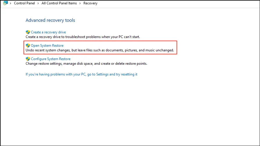 Если вы попробовали все вышеперечисленные шаги без каких-либо положительных результатов, восстановление системы может быть единственным вариантом. Это позволит вам вернуть ваш компьютер в прежнее состояние, когда проблемы не было. Однако для этого необходимо, чтобы вы уже ранее настроили точку восстановления. Если у вас нет точки восстановления системы, перейдите к следующему исправлению.