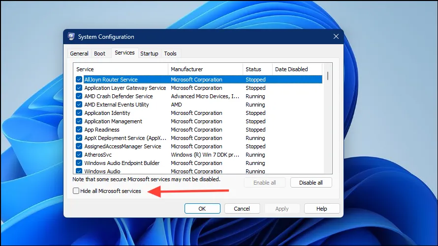 - Затем нажмите кнопку «Отключить все», чтобы отключить все службы сторонних производителей на вашем компьютере.