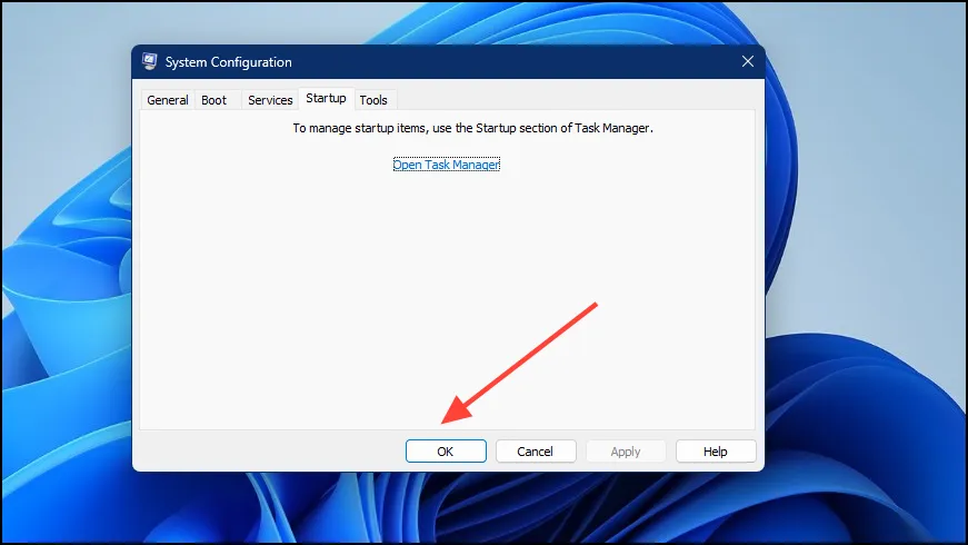 - Закройте диспетчер задач после отключения служб, а затем нажмите кнопку «ОК» в утилите настройки системы.