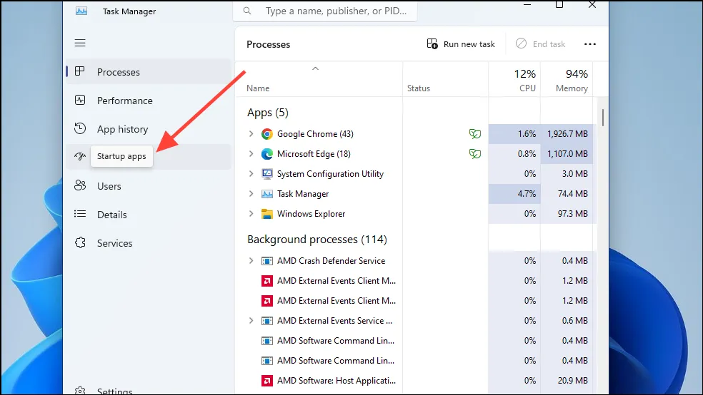 - В диспетчере задач по умолчанию будет открыта вкладка «Процессы». Нажмите вкладку «Приложения при запуске» слева, чтобы просмотреть приложения, которые запускаются при загрузке Windows.