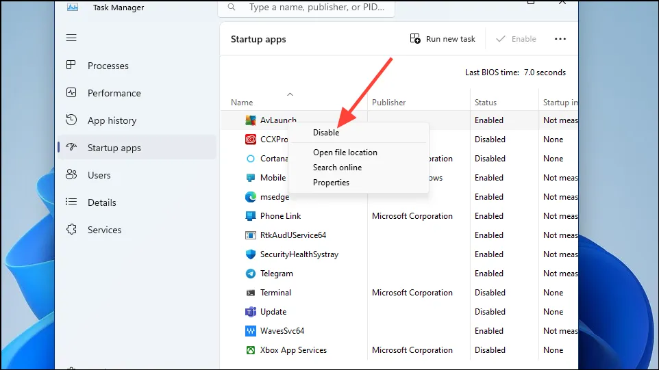 - Теперь вам нужно будет отключить каждое приложение здесь, чтобы оно не запускалось при загрузке Windows. Для этого просто щелкните правой кнопкой мыши приложение и выберите опцию «Отключить».