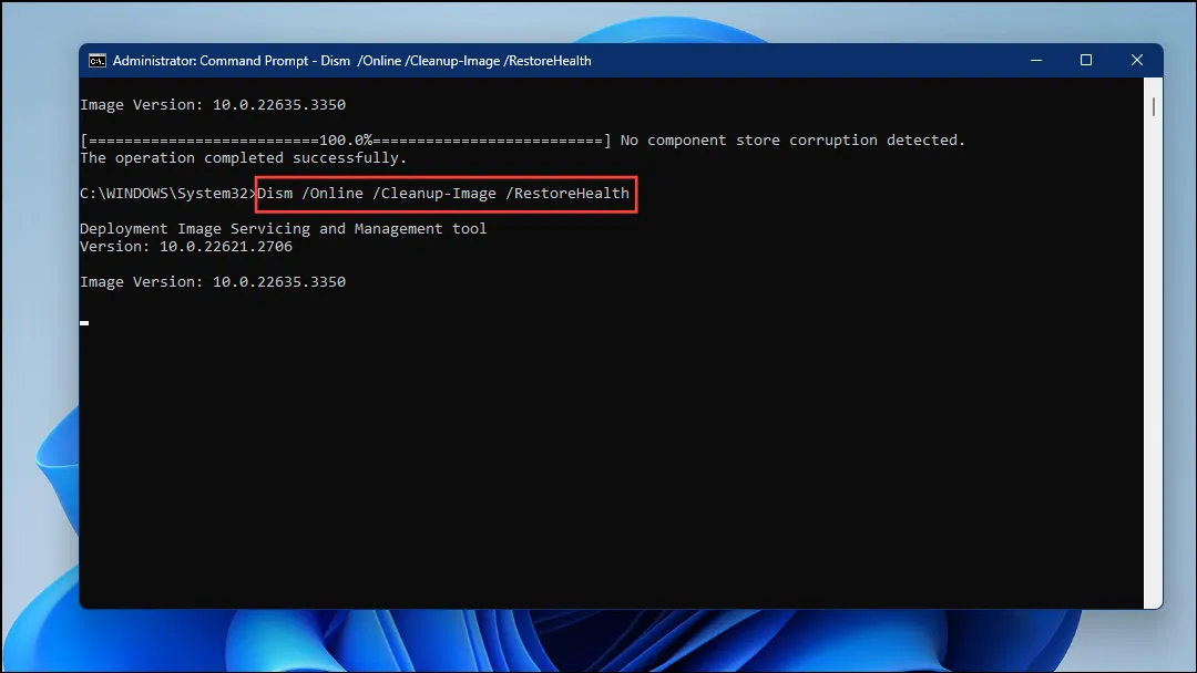 DISM /Online /Cleanup-Image /RestoreHealthчтобы начать сканирование DISM.
