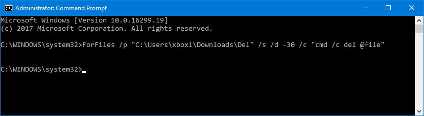 "C:pathtofolder"указав путь к папке, в которую вы хотите удалить файлы, и измените/d -30чтобы выбрать файлы с датой последнего изменения.