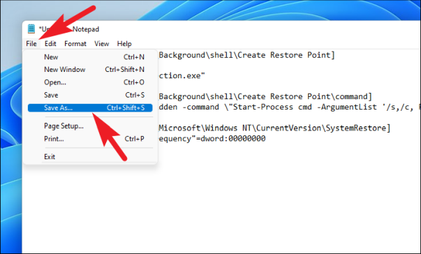 Затем введите или скопируйте+вставьте указанный ниже код в файл блокнота. После вставки щелкните вкладку «Файл» в правом верхнем углу окна Блокнота и выберите параметр «Сохранить как». На вашем экране откроется отдельное окно.