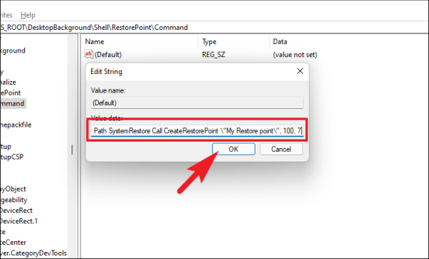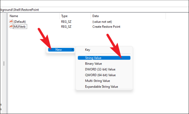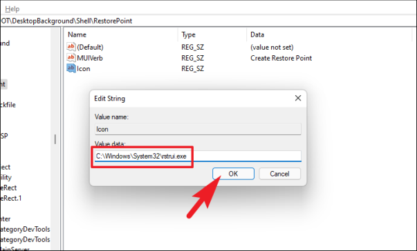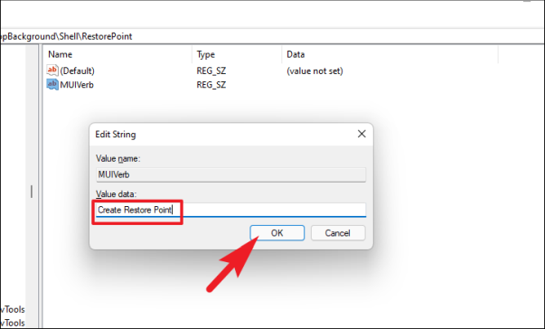 Теперь дважды щелкните MUIVerbстроковый файл, чтобы отредактировать его. Затем в текстовом поле под типом поля «Значение:» Create Restore Pointнажмите кнопку «ОК», чтобы сохранить изменения и закрыть окно.